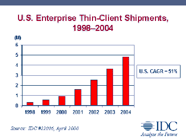 Powyższy wykres pokazuje prognozy sprzedaży stanowisk pracujących w tej technologii do odbiorców korporacyjnych. IDC podaje, że w ankietach 50% respondentów przyznaje, że zamierza wymienić PC-ty na terminale. Szacuje się, że obecnie wszystkich sprzedanych licencji na ten typ dostępu do Windows to już ok. 6.000.000 a użytkowników jest ok. 30.000.000 (to znaczy średnio jedna licencja jest używana “na zmianę” przez ponad cztery osoby!). Ten rezultat także daje wiele do myślenia. W ubiegłym roku Gartner Group w 200 roku prezentował swojej prognozy, gdzie między innymi stwierdzono, że w roku 2003 sprzedaż PC-tów i różnego typu terminali nie będących PC-tami zrówna się! Jak się okazuje recesja nie była aż tak silna jednak tendecnja do konsolidacji pozostała. Pokrewne tej technologii prognozy poniżej: