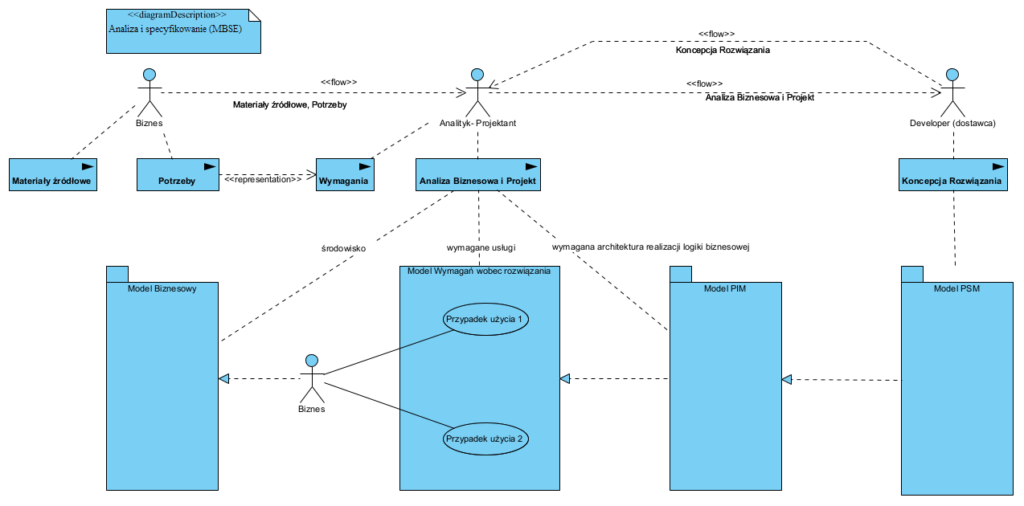 W projekcie mamy trzy kluczowe role: biznes, analityk-projektant i developer. Biznes zgłasza potrzeby i dostarcza materiały jakimi są tu wszelkie pisemne artefakty jakie powstają w analizowanej firmie . Na tej podstawie spisywane są wymagania (wobec rozwiązania). Po zebraniu i zatwierdzeniu wymagań i na podstawie materiałów, powstaje model biznesowy i projekt rozwiązania: logika oprogramowania, tej jego części, która realizuje potrzeby biznesowe (spełnia wymagania). Projekt to właśnie wymaganie jakie musi spełnić dostawca (developer): dostarczyć oprogramowanie zgodne z projektem, a tak naprawdę komputer odpowiadający na potrzeby biznesu.