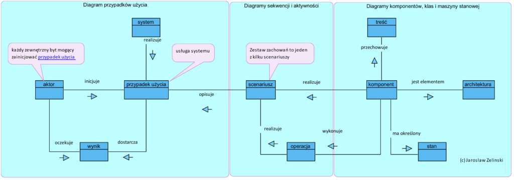Patrząc na to jakich diagramów używamy i do czego, można zbudować taki model pojęciowy: