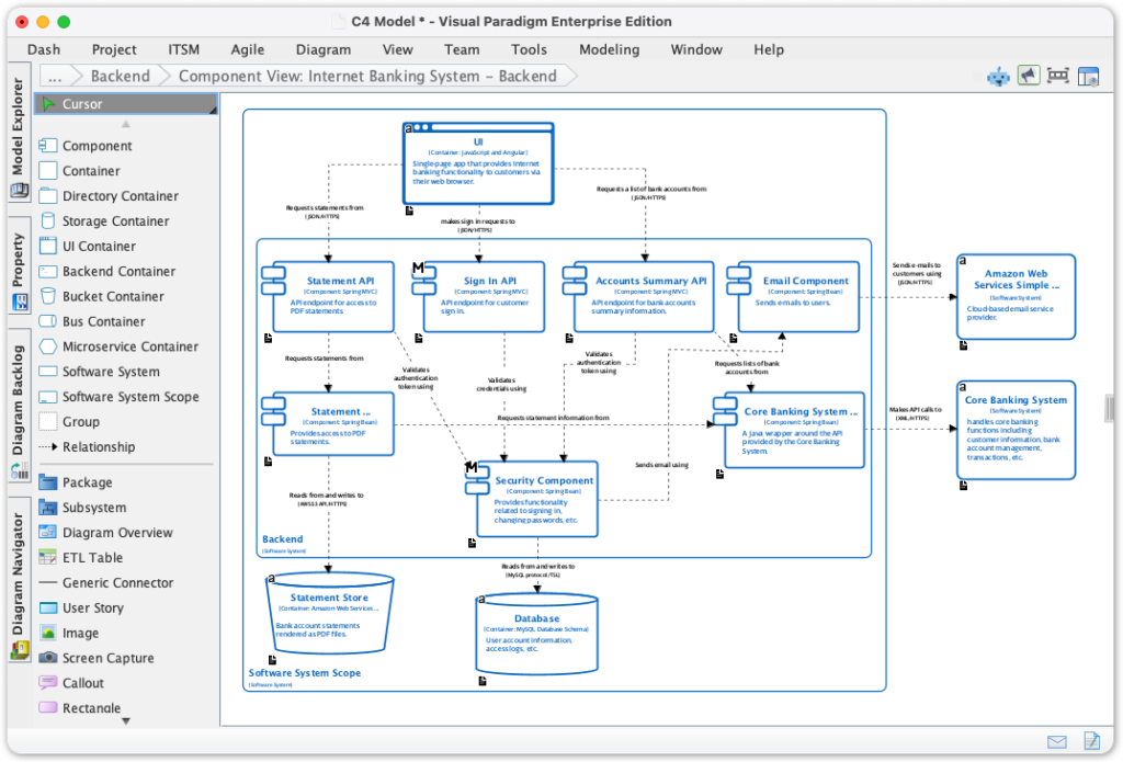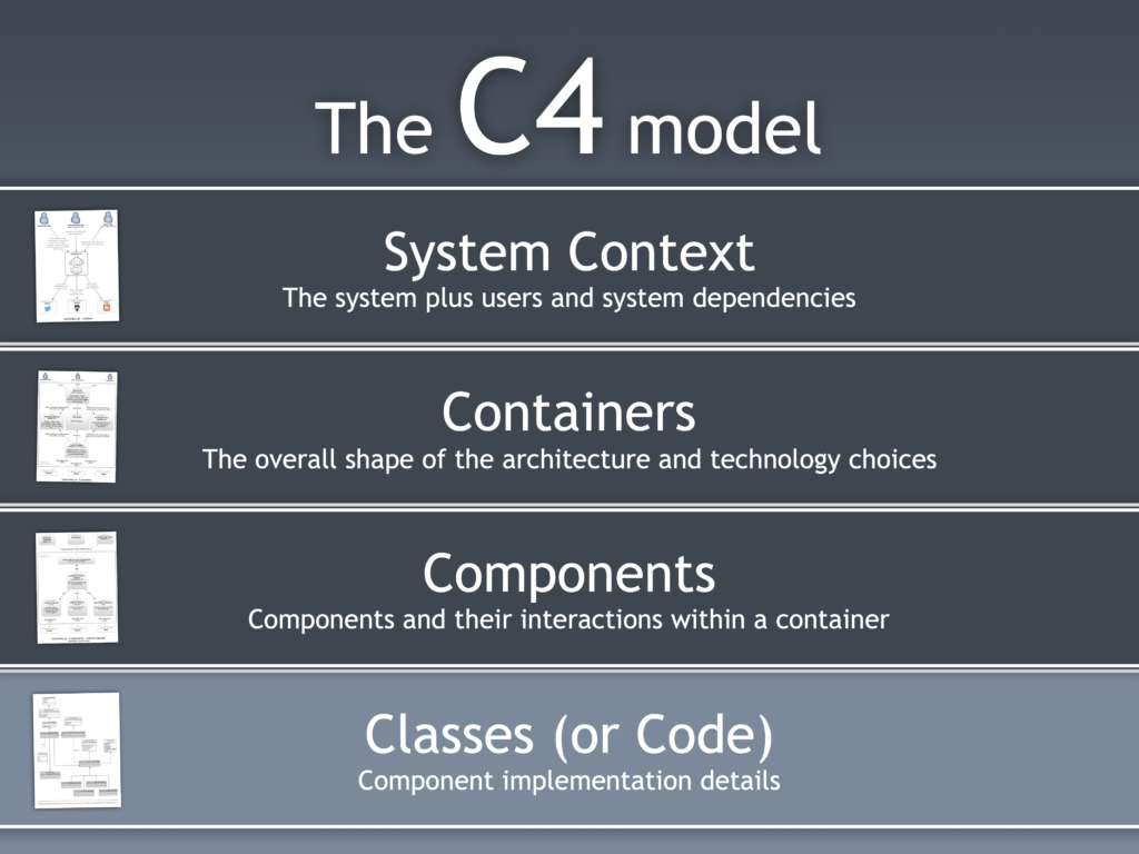 System oprogramowania składa się z jednego lub więcej kontenerów (aplikacji i magazynów danych), z których każdy zawiera jeden lub więcej komponentów, które z kolei są implementowane przez jeden lub więcej elementów kodu (klasy, interfejsy, obiekty, funkcje itp.). A ludzie (aktorzy, role, personas, nazwane osoby itp.) używają systemów oprogramowania, które tworzymy.