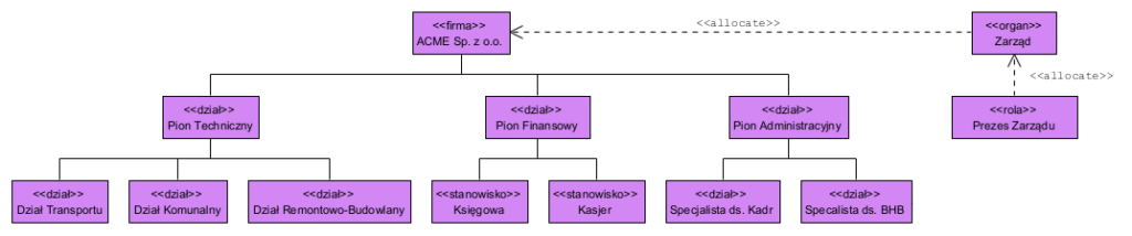 Pion Finansowy to nazwa działu (Gł. Księgowa to nazwa roli). Taki diagram ma proste reguły: jednostki podrzędne są poniżej swoich nadrzędnych a dany bloczek klasyfikujemy nadając tak zwany stereotyp (wyrażenie <<xxx>>). Zarząd to reprezentacja spółki, nie jest to element struktury organizacyjnej ale można go zobrazować.