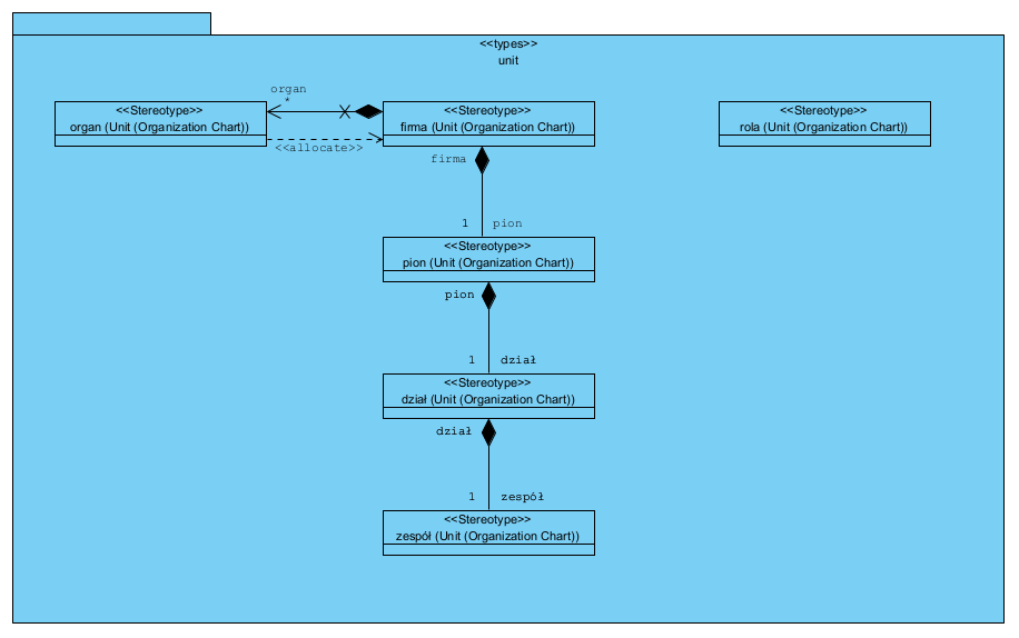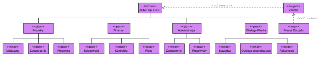 Diagram (model) struktury organizacyjne to z reguły “bloczki” na diagramie. W prostej wersji te bloczki będą miały nazwy, a to czym one są często pozostaje często w sferze domysłów. Dlatego pierwszą rzeczą do wykonania w projekcie standaryzacji i analizy procesów biznesowych jest formalizacja struktury organizacyjnej. Po przeprowadzeniu formalizacji diagram wygląda tak: