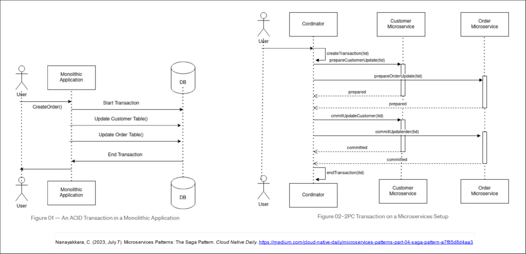 Nie ma żadnej komunikacji między mikro-serwisami (dla mikro serwisów, po prawej, stosujemy wzorzec Saga):