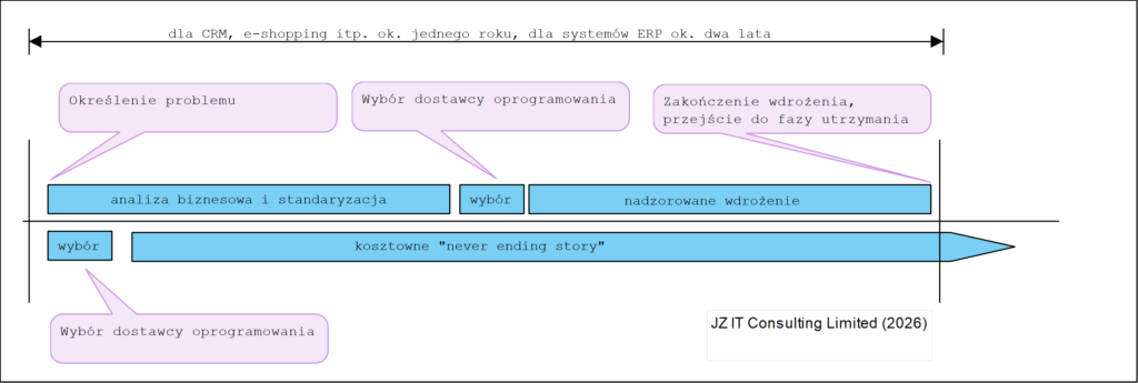 W efekcie projekt taki skupia się od początku na dopasowywaniu przedwcześnie wybranego systemu, zamiast najpierw opracować wymagania i przygotować się wewnętrznie do wdrożenia. Kilka spostrzeżeń na ten temat w artykule: Kto winien porażki projektu?