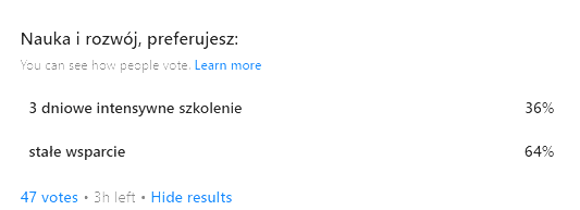 Jak widać,2/3 respondentów oczekuje stałego wsparcia, 1/3 oczekuje szkoleń, w komentarzach do ankiety wiele głosów, że obie formy są oczekiwane. Szkolenia jak najbardziej zostaną, patrz strona eduFuturo.