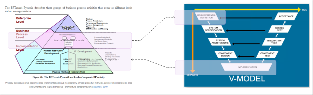 Dokładny opis czytelnik znajdzie w Artykule TOM – Architektura Korporacyjna oraz V-model i iteracyjne budowanie systemów. Można te zobaczyć tak opracowany model działania Mojej firmy.